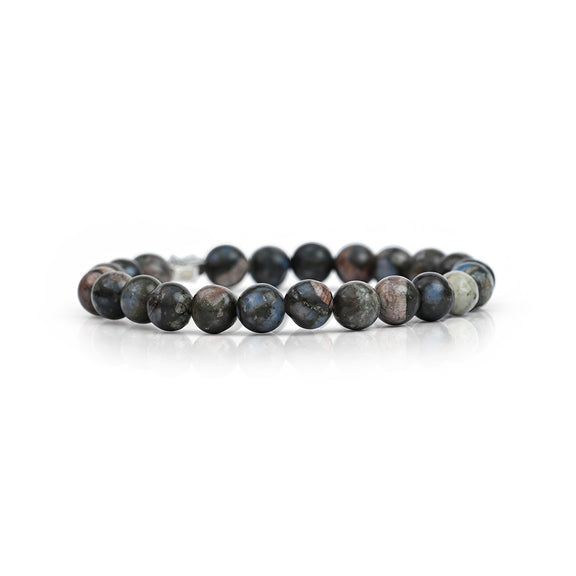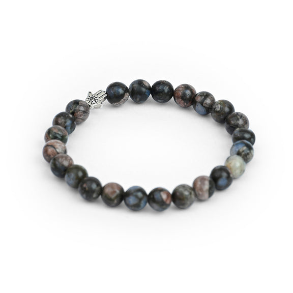 Featuring a natural mix of blush pink, grey, and subtle blue flecks, every bead is uniquely patternedβmaking this bracelet a one-of-a-kind expression of love and inner strength.